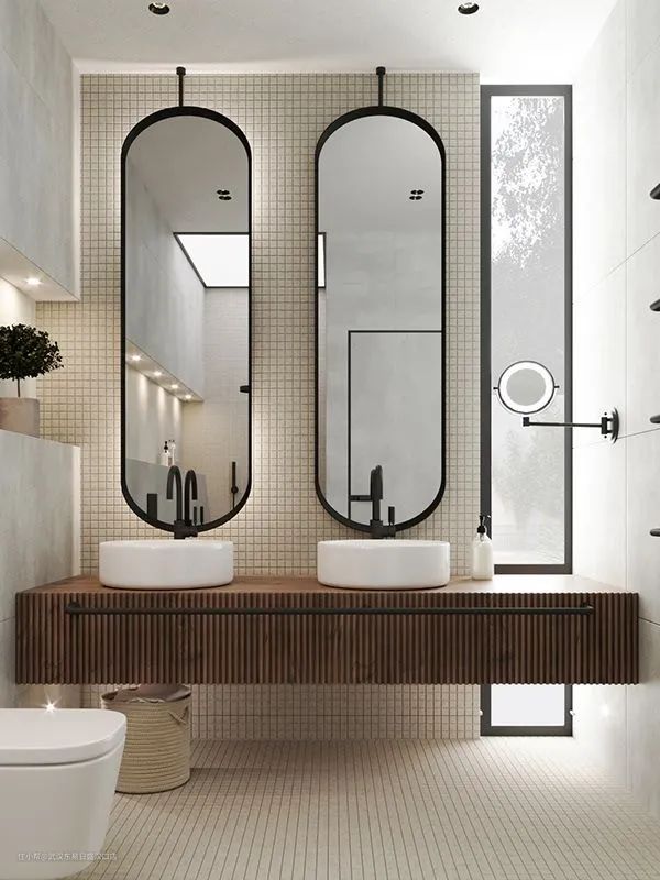 悬浮式浴室柜也就是挂墙式浴室柜,这类柜体在我们日常的设计中非常常见,下方悬空的设计避免了柜体与地面的接触,可以有效的减少湿气入侵,这类型柜体一般伴随着墙排水使用,方便打理,效果美观。