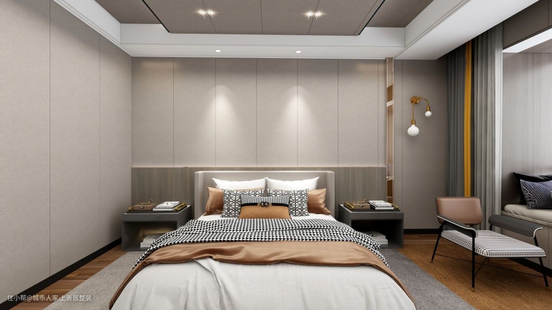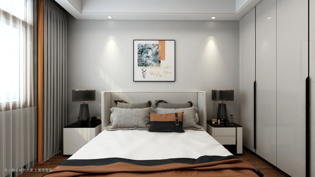 最后来看一下风格相同却又个性鲜明的三间卧室,卧室都选择温暖的灰白色系打底,主卧大气质朴,收纳衣柜+对称床头柜台灯设计,立体感很强!次卧客房都选择独具个性的灯盏装饰,艺术气息扑面而来~
