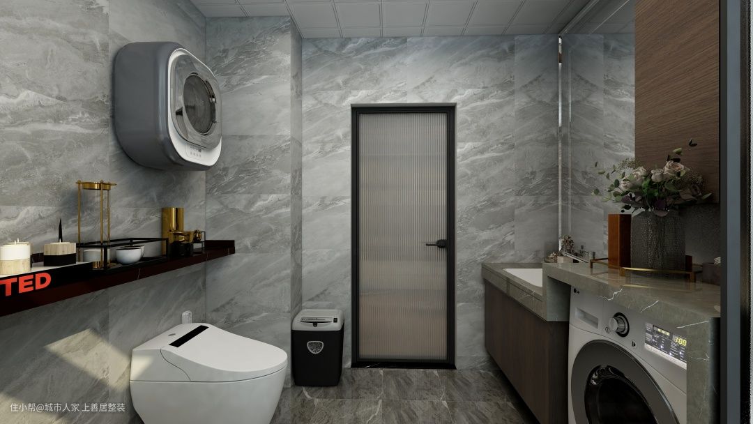卫生间用大理石花纹的瓷砖打底,洗衣机也有自己的定制款“小归宿”,不留死角,便于清洁卫生。