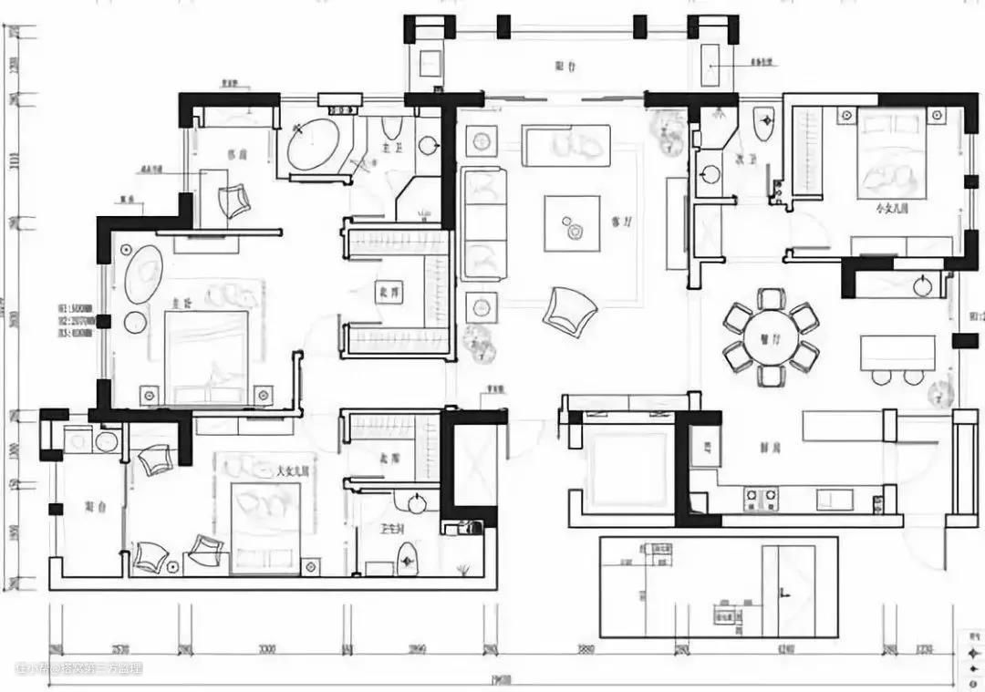 ①承重墙(图中深色部分),这个后期如果有拆墙需求,一定不能动!