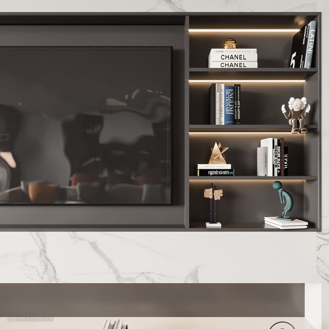 客餐厅是一个大横厅,大大的落地窗为室内提供了充足的采光,定制的电视背景墙,中部做空设计,将电视嵌入其中,也增加了收纳区域。