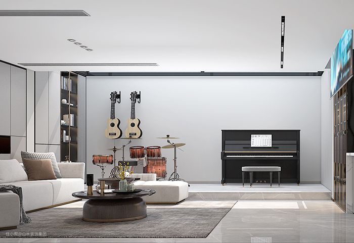 除了客卧之外,影音室也设置在了地下一层。米白色的休闲沙发与投影仪,构成了影音室的主角。除此之外,孩子增加了书柜和钢琴、架子鼓,一房多用的设计增加了空间利用率。