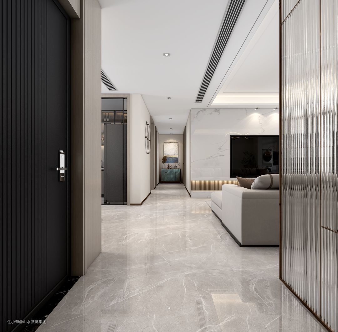 以一扇玻璃隔断将玄关与客厅进行空间分割,透光不透人的长虹玻璃模糊了视线,朦朦胧胧的视觉呈现引入丝丝神秘感,有效保护了家居隐私。入户的临时收纳依赖于通顶设计的玄关柜,中空的处理方便放置包包、钥匙等小件物品,设计上更加人性化。