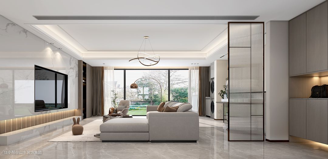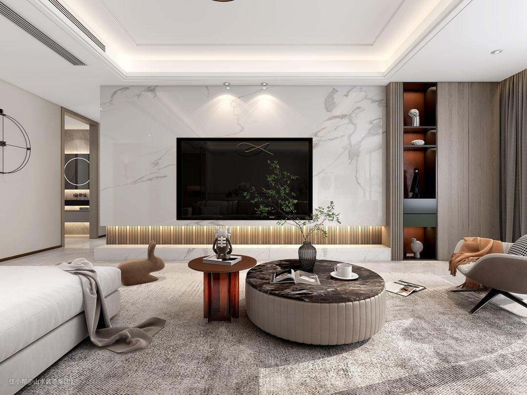 岩板+木格栅+灯带+地台的悬浮式电视背景墙设计,强调空间的整体感,同时不忽视现代风的简洁与时尚。环形结构的主灯点亮一方场域,温暖的灯光让家更显温馨。