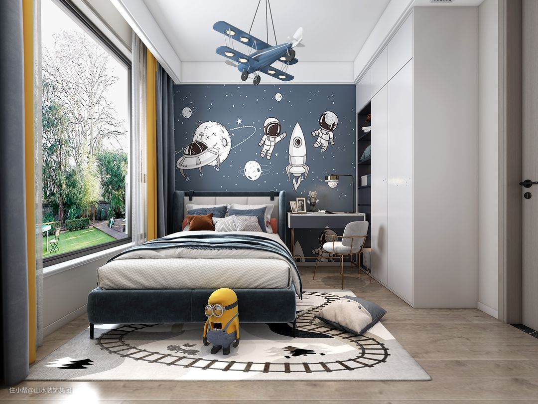 男孩的房间更多的是蓝色元素,飞机、飞船、宇航员、小黄人等,卡通元素的引入既丰富了空间,也增加了童趣。空间不大,便将学习桌取代了床头柜,同样可以满足孩子未来的学习需求。