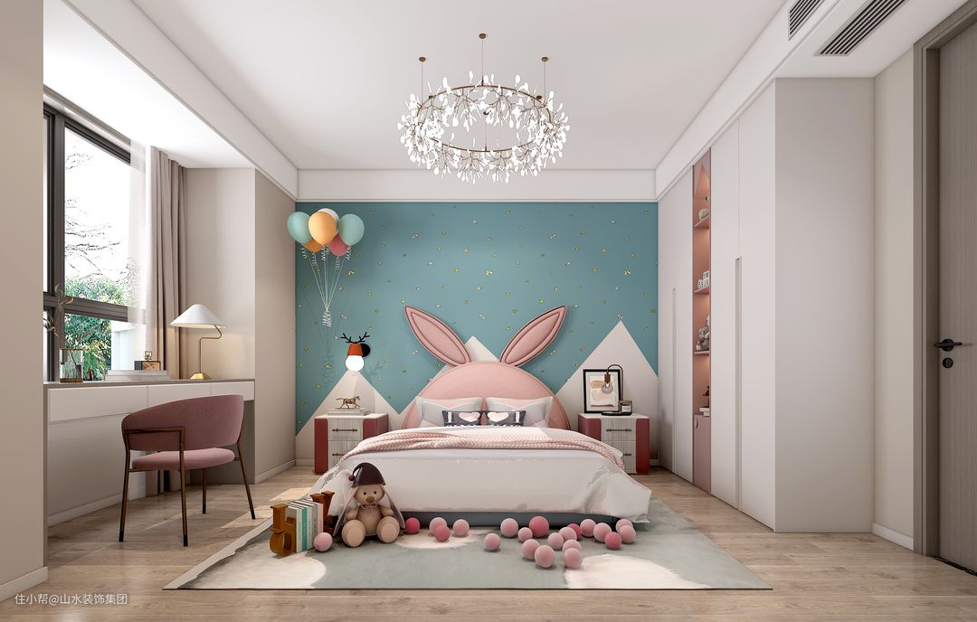 女儿房选择粉色+浅蓝进行装饰,加入了孩子很喜欢的兔子元素,气球、玩偶等点缀,一个唯美梦幻的王国便呈现了出来。虽然孩子还小,但设计师仍然将未来的学习需求考虑在内,沿窗设置了学习区域。