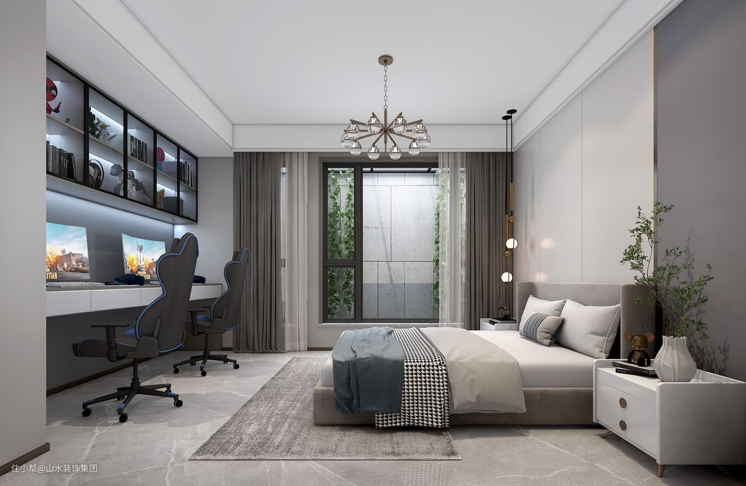 客卧在功能上更加丰富,除了睡眠区域之外,还增加了游戏区,双人座的书桌加上两台电脑与电竞椅,两个人闲暇时打打游戏也是非常惬意放松的。