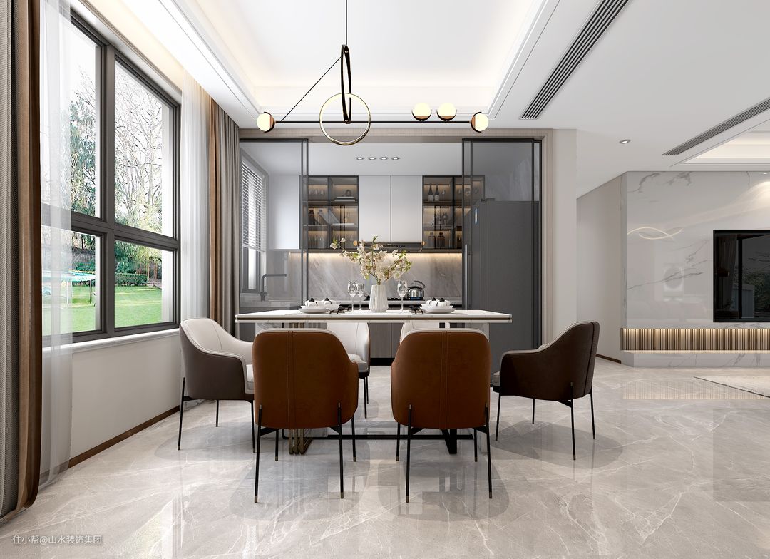 南北通透的空间布局,餐厅临北而设,与客厅形成开放式布局,动线设计上更加快捷方便。长方形的岩板餐桌搭配着跳色处理的餐椅,正好可以满足一家人的日常用餐需求。通铺的地砖让视线得以延伸,无形中发挥着扩容的作用。