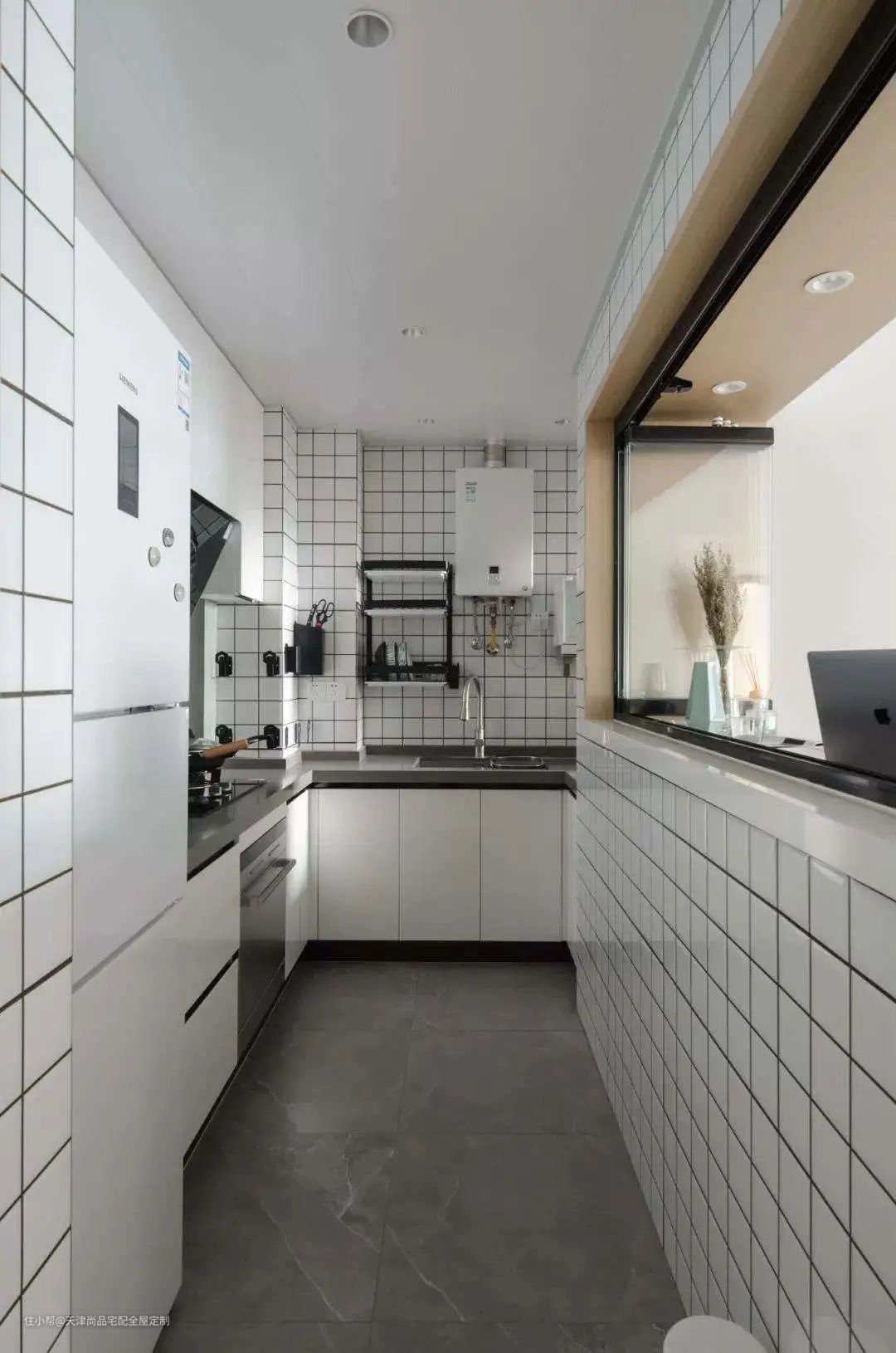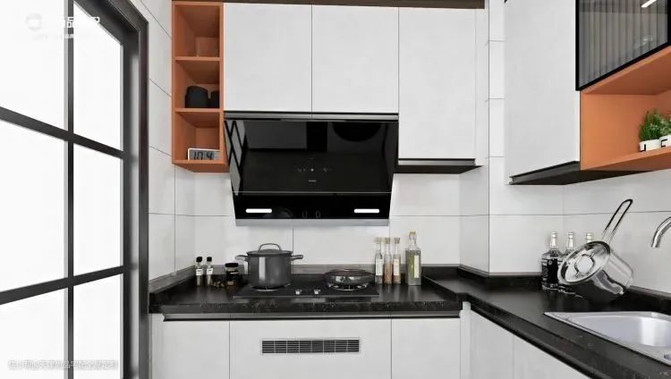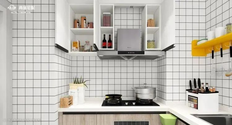 ▲ 厨房瓷砖和橱柜的颜色以浅亮色为主,可以增加空间的采光,使视觉更加透明明亮,照明采用主灯+局部重点照明,也可以增加落地灯和射灯作为辅助光源,扩大照明范围。