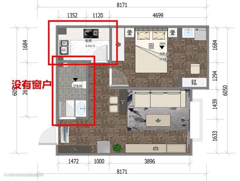 没有窗户的厨房和暗卫,光线都很昏暗,我们通常称之为“暗厨暗卫”,像上图这种小户型更容易遇到这种情况。