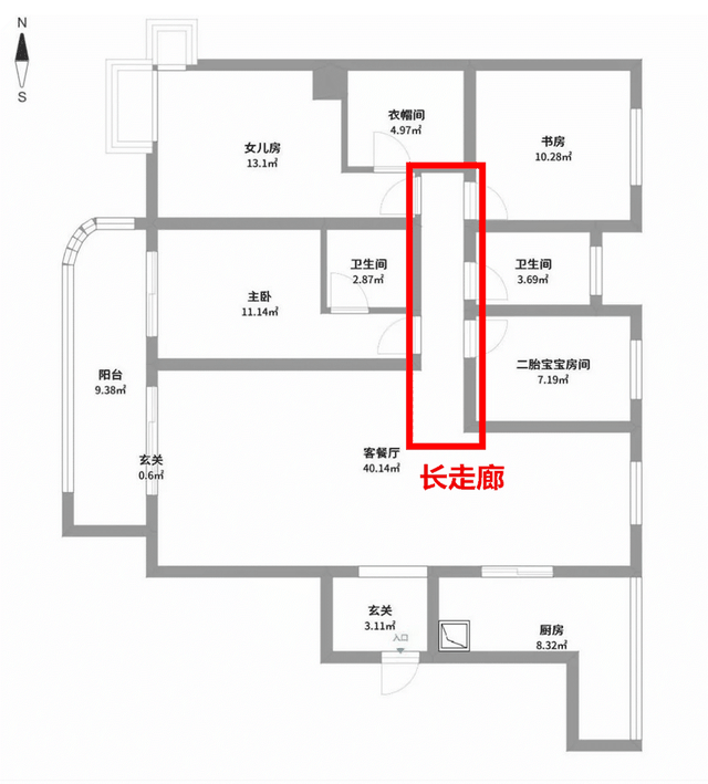 过道过长是大房型中的常见问题,因为大多数房间分布在一个过道中,过道相对较长。这种长廊很容易让人觉得昏暗,让人觉得不舒服。