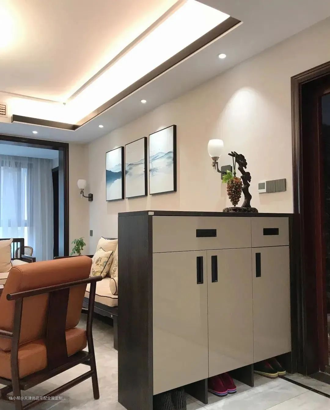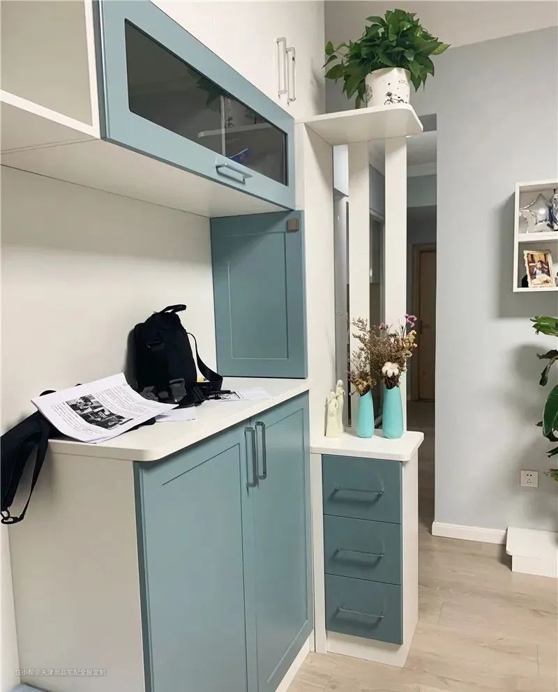 ▲ 业主家的入户门正对主卧门,靠墙设计了一个小转角玄关柜,完美解决了对穿问题,营造了开门观景的感觉。