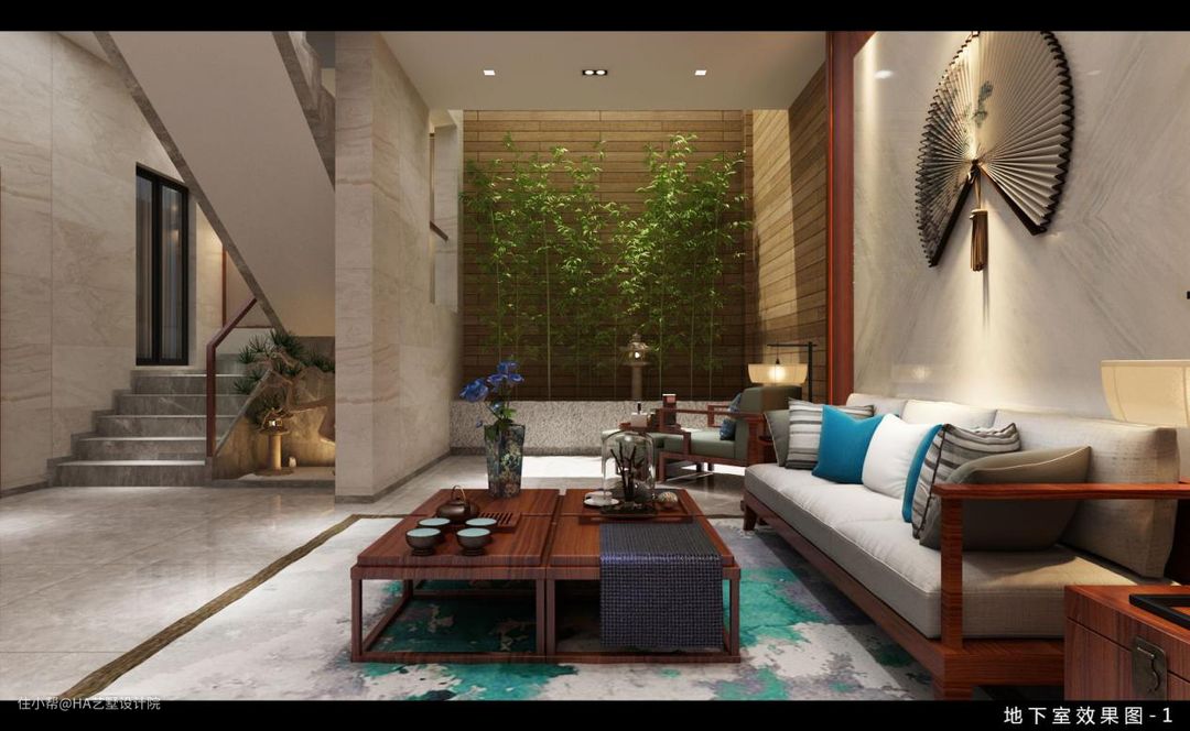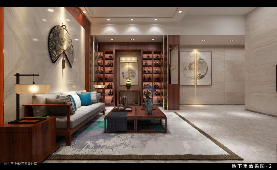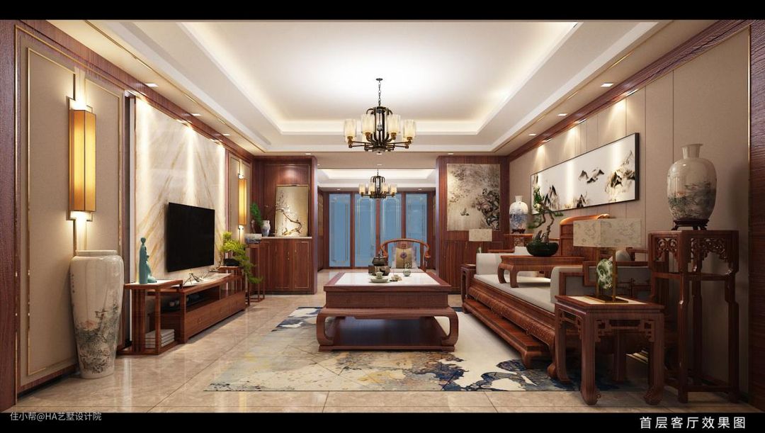 选用材料:大理石地砖、墙砖,落地窗、红木家具、新中式装饰画、极简筒灯、中式壁灯等