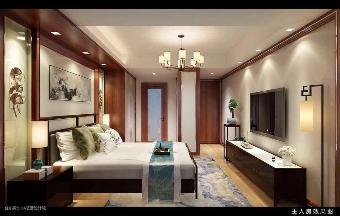 主卧的设计也是中国风满满。房间整体贴了白色的壁布,在筒灯的照射下显得暖意十足,十分适合休息。床体、床头柜和电视柜选用了同一个系列,床头背景墙居中放置了一幅油墨风景画,和整体环境很是搭配。主床的四周还贴心的铺设了地毯,让家里都有一种五星级高档酒店的感觉,奢华感和舒适感都完美展现。