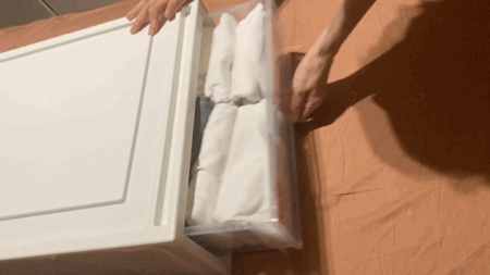 这样你就能自由地用收纳抽屉来划分空间,每次换季只需要把装着不同季节衣服的抽屉柜互换位置就好了,3分钟搞定换季收纳!