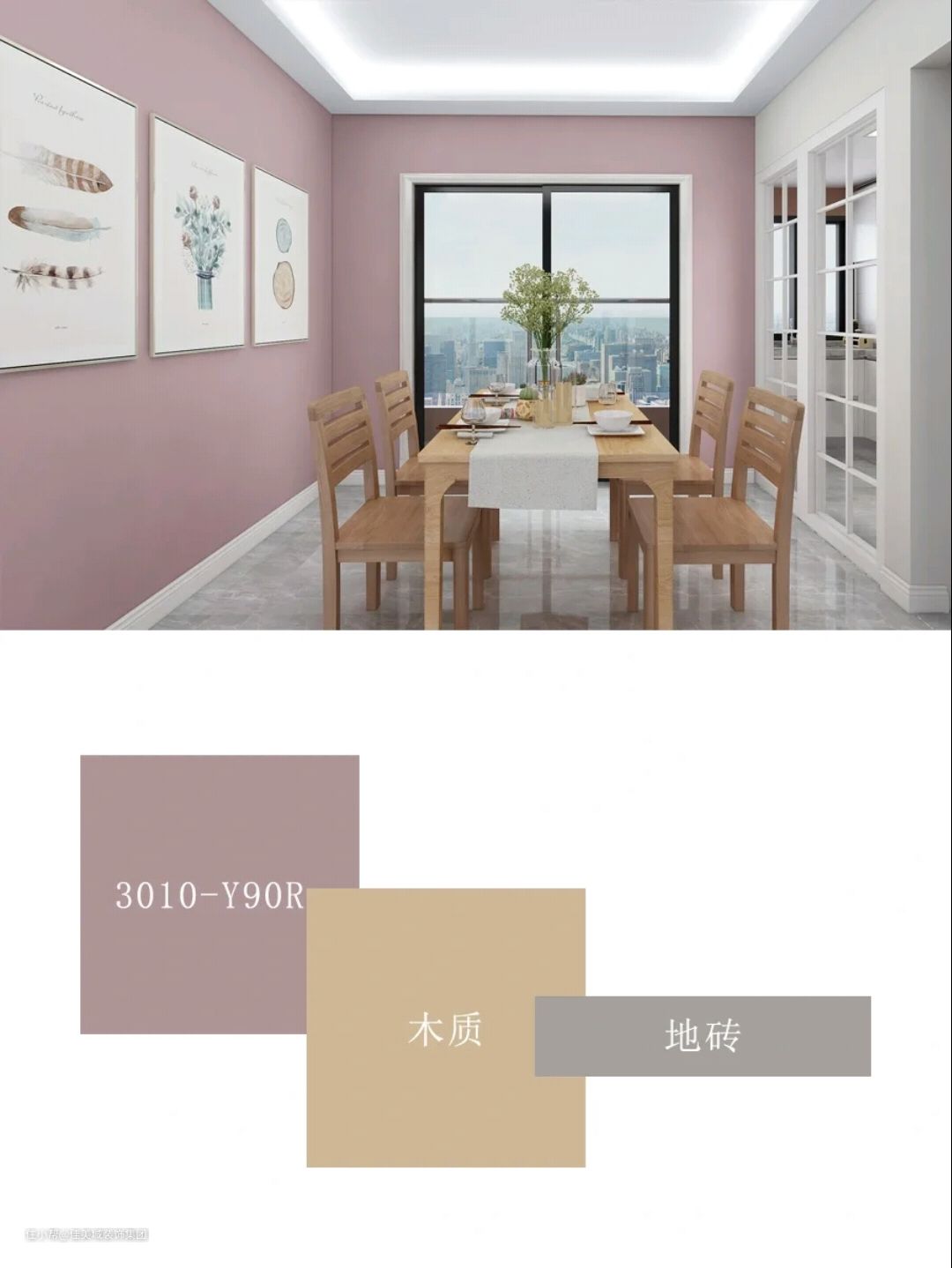 餐厅大胆使用了豆沙粉作为空间的视觉主导,是平日里很难见到的墙面配色,大面积涂刷更能增添时尚感。