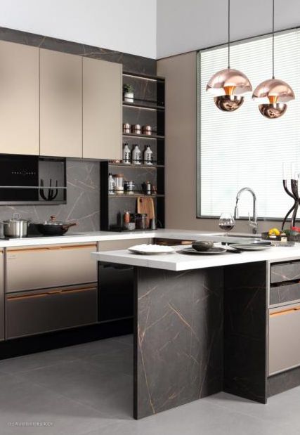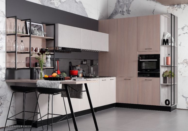 (2)L字型橱柜,充分利用厨房转角空间,将洗涤区、加工区、烹饪区按顺序组成黄金三角区,缩短移动路线,让烹饪事半功倍。