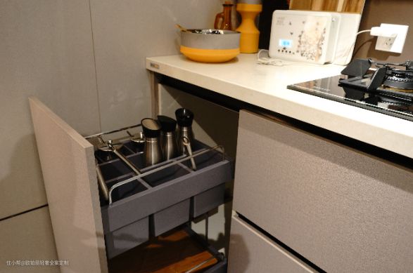譬如下拉拉篮、锅具拉篮、转角拉篮等等,以下图的欧铂丽调味拉篮为例,它通过两层分离式设计,上层存放常用矮罐调味料、侧边收纳砧板、下层放置较高的调味料,让物品尽收眼底,拿取更方便,防止台面瓶罐堆积而导致的不美观和易沾染油污的问题。