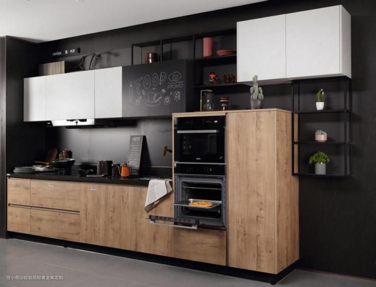 (1)一字型橱柜,可将所有功能区按顺序都安排在一直线上,让所有烹饪设备一目了然,下厨不再兵荒马乱。