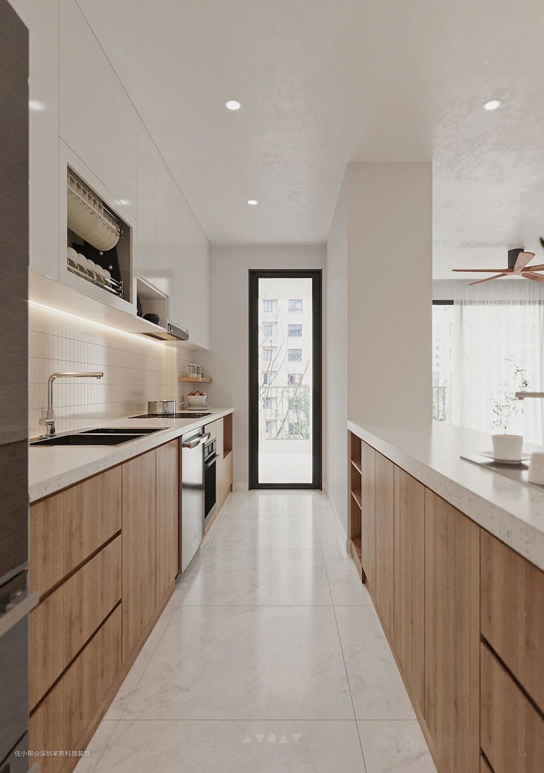 狭窄的厨房将视线引向可欣赏城市景观的高大窗户。