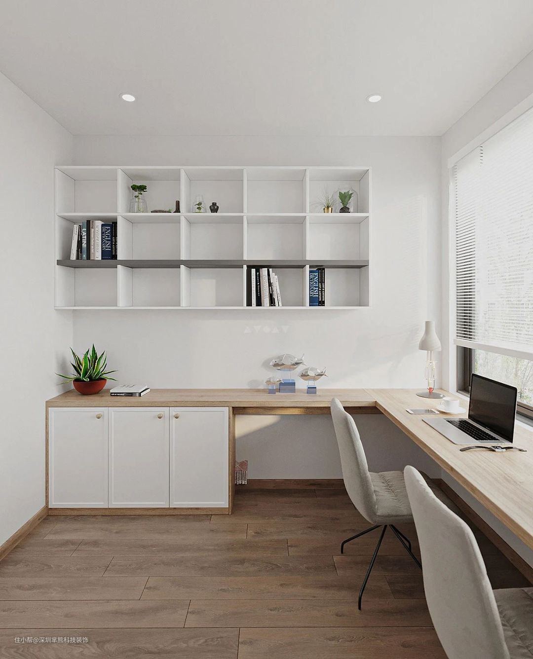 在家庭办公室内,一个双工作区面向窗台灯和景观。