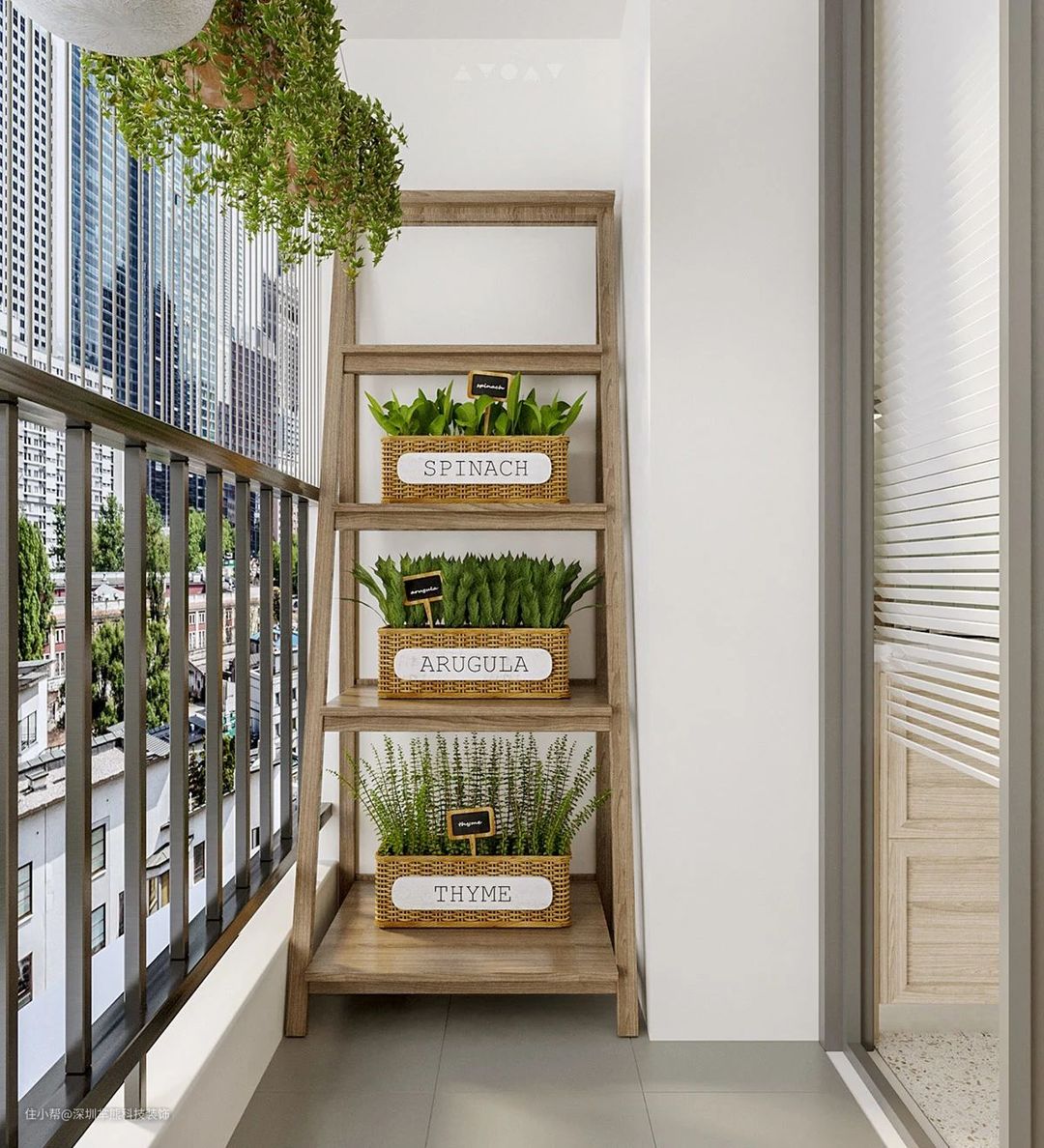 梯子架子上放着一组匹配的藤制室内药草花盆。