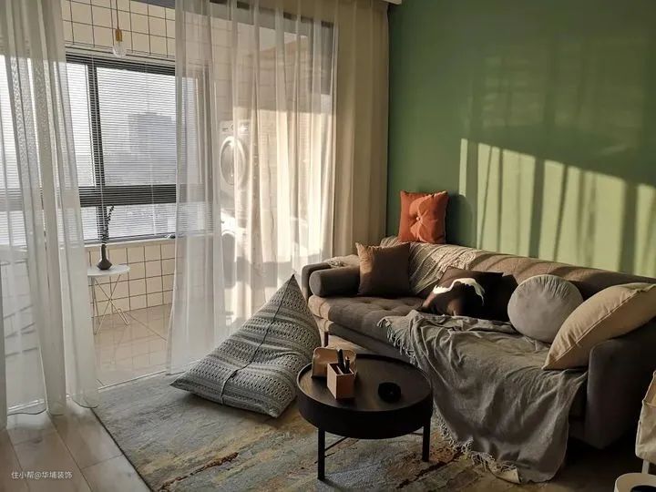 【后退色】纯度低、明度高、冷色相的颜色通常会被称为“后退色”,比起浅色更适合用在窗帘、墙面、装饰画上。有种“我离墙面好远”的错觉,显得空间不那么逼仄。
