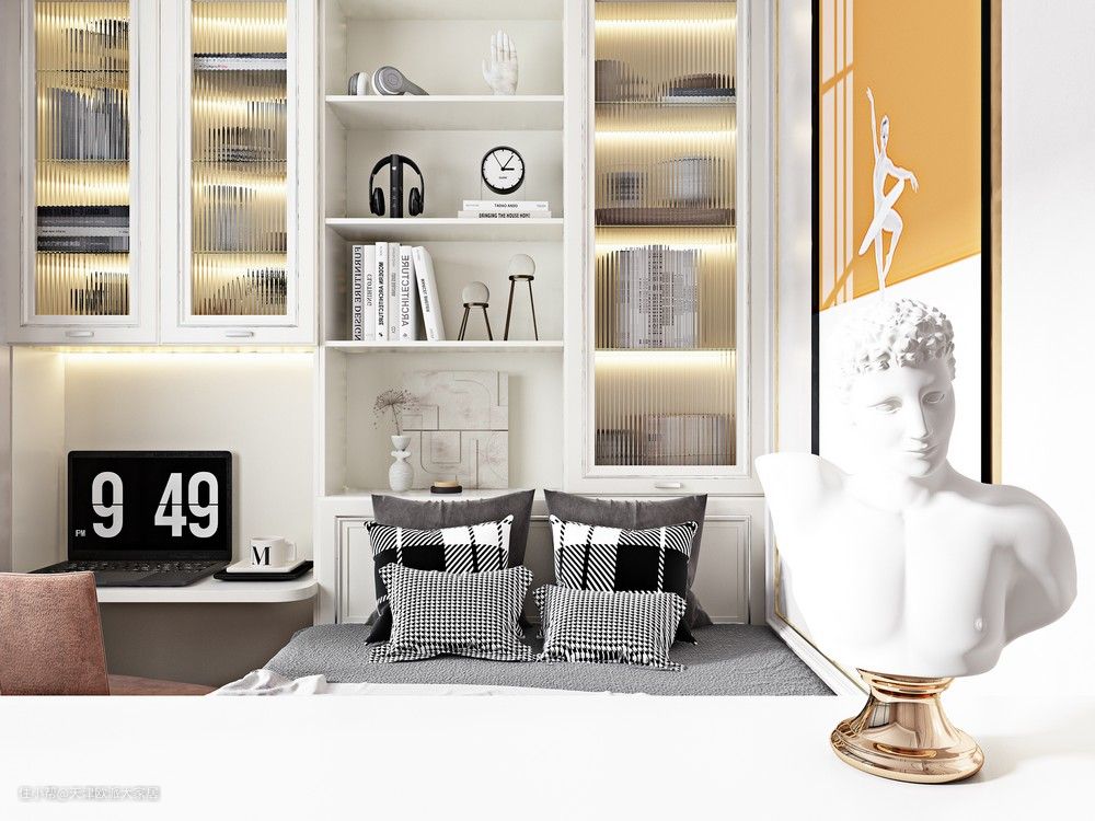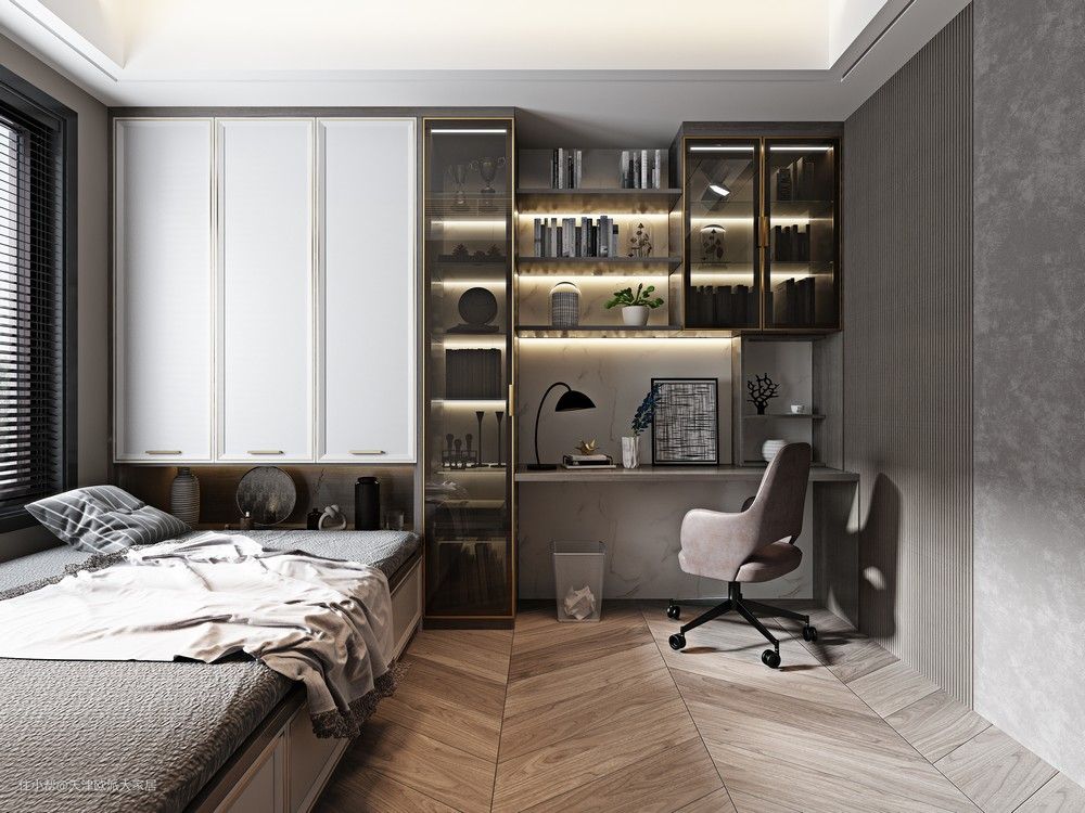 ▲除了床头旁的开放式收纳区,还有一侧的到顶玻璃柜,收纳业主珍藏的手办,无论工作场景还是睡眠场景,都能让业主被所爱包围。