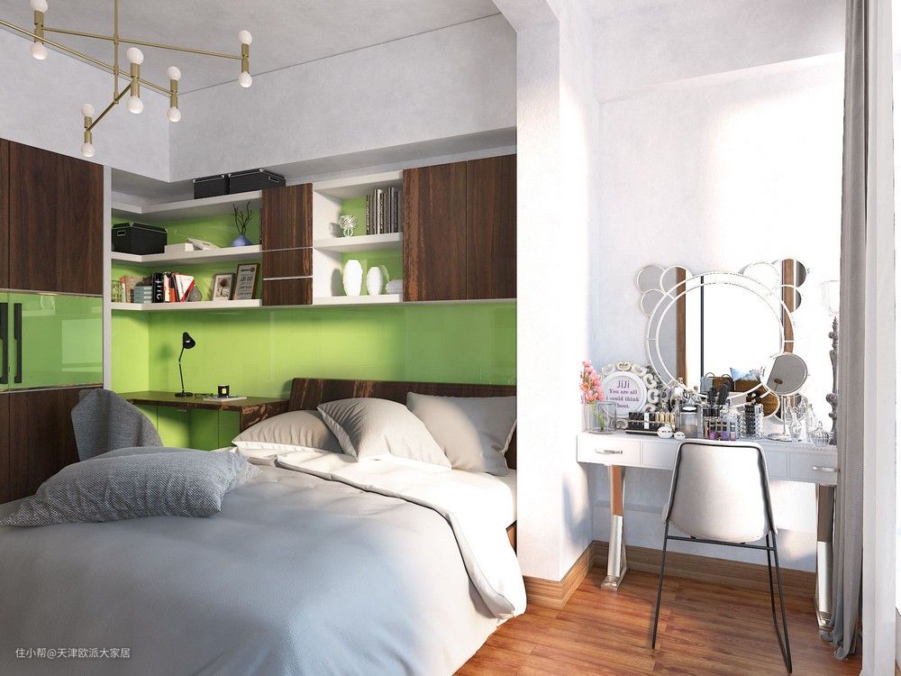 ▲这个案例的卧室层高比较小,做的是小巧一点的床头柜,让空间显得轻盈。值得一说的是,悬空式的柜体设计,不留卫生死角,想要搞卫生方便的业主,可以参考这个做法。