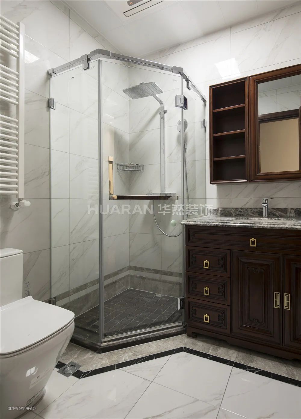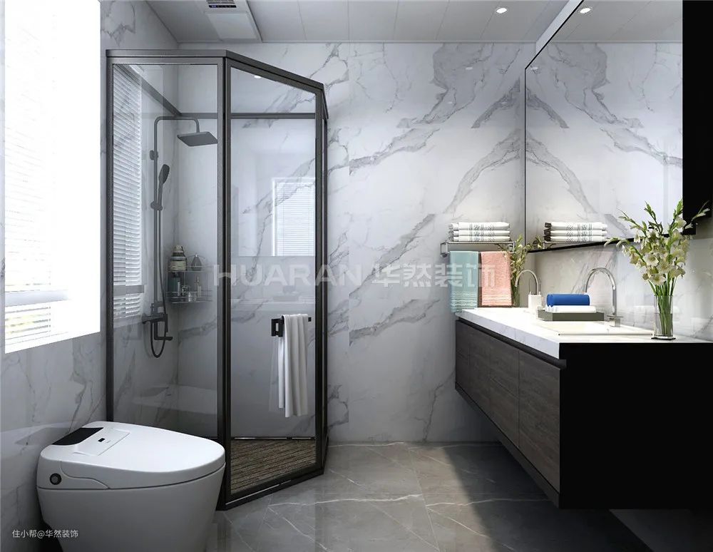二分离有两种分法,一种是将潮湿区(淋浴区)和干燥区(马桶区、洗漱区)分成两个区域,一般用浴帘或淋浴房将淋浴区与其他功能区隔开,让整个空间看起来更清爽。