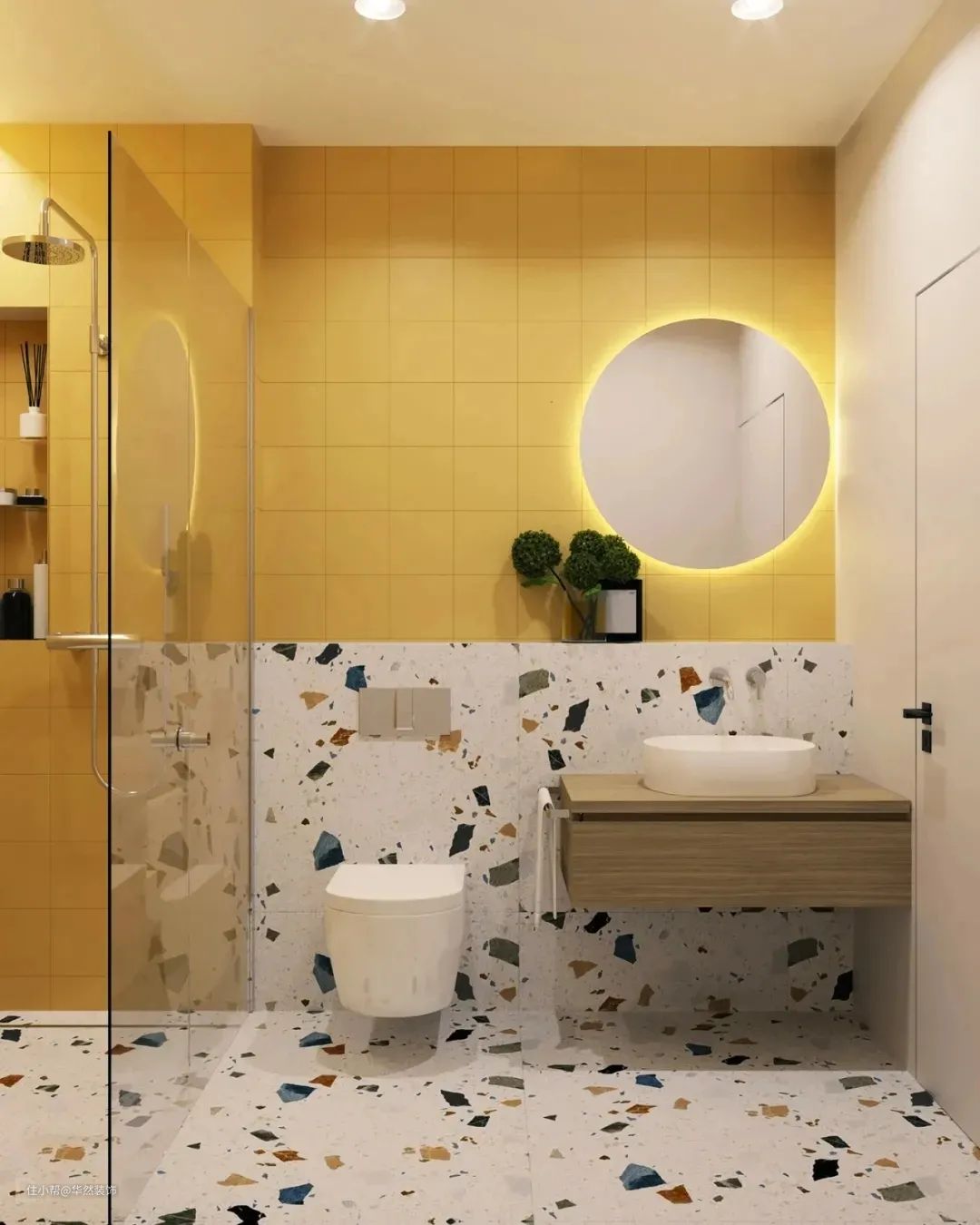 在选择卫生间的墙面与地面材质时,大多选择黑白灰系列。然而,看惯了千篇一律的颜色,总有些审美疲劳。如果有不同的色彩搭配,让单调的卫生间变得五彩缤纷,会带来意想不到的美感。