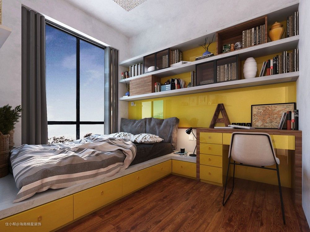 ▲床头上方有梁柱,也可以用床头柜让梁柱和柜体融为一体,把鸡肋空间变废为宝,开发墙面空间,一次满足收纳和写作的需求。