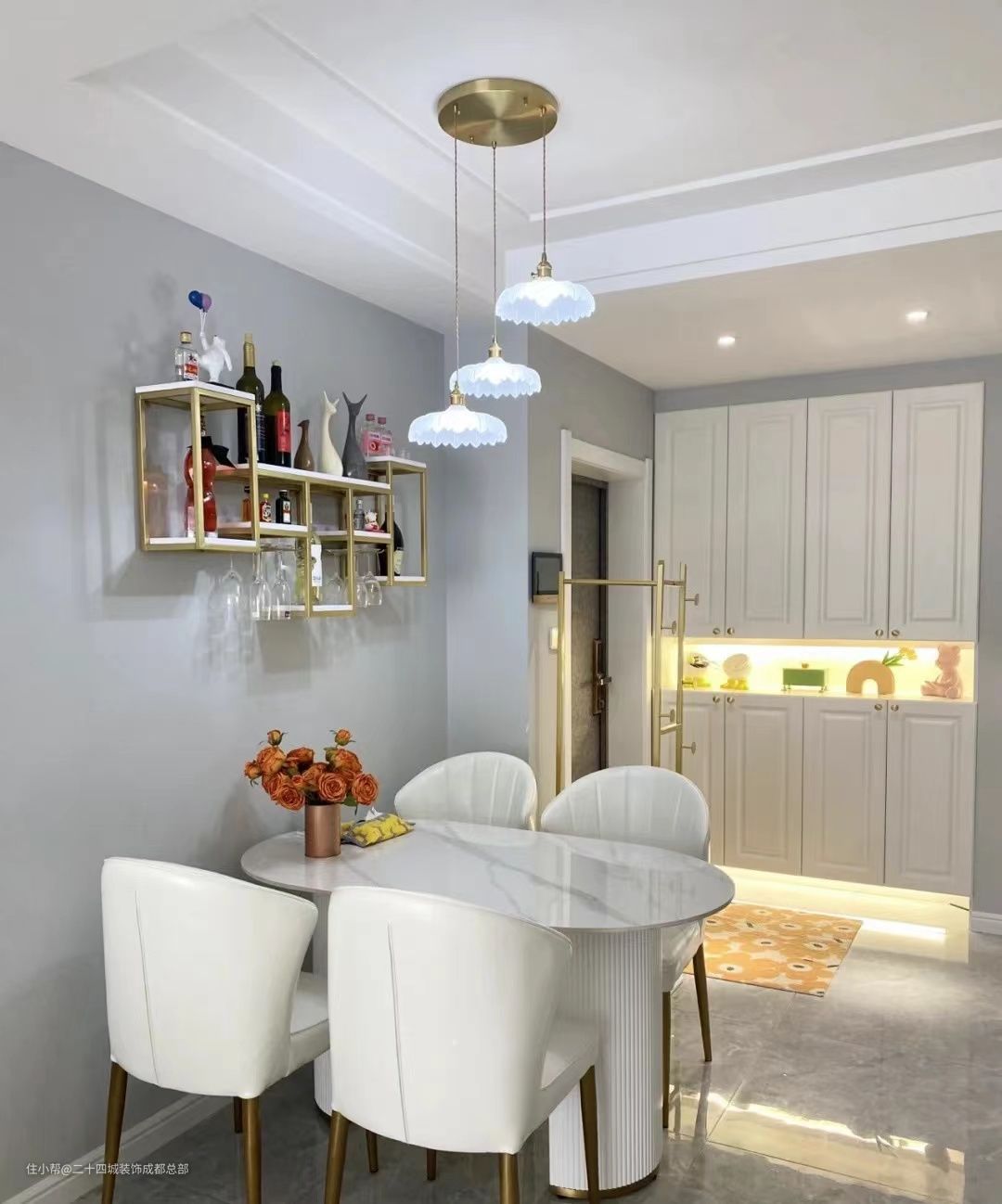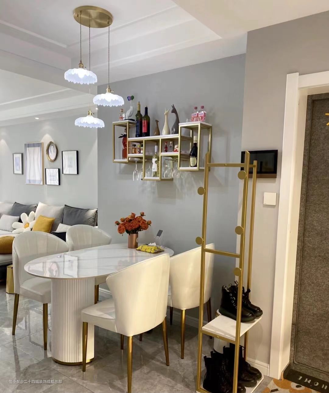 进门的右侧就是餐厅,空间有限,没有做餐边柜,在背景墙的墙面做了1个玫瑰金的酒架,可以存放少量的酒和高脚杯,酒架虽然不大,但对于普通家庭来说还是足够了。