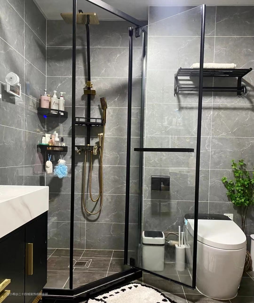 淋浴区做了钻石型的隔断,黑色的窄边不锈钢,搭配高透的玻璃,既能起到遮挡水汽的作用,又让空间感非常的通透。旁边的位置是马桶区域,安装了智能马桶,非常的方便。马桶上方的空间也不能浪费,加上一个毛巾架,可以收纳浴巾等。