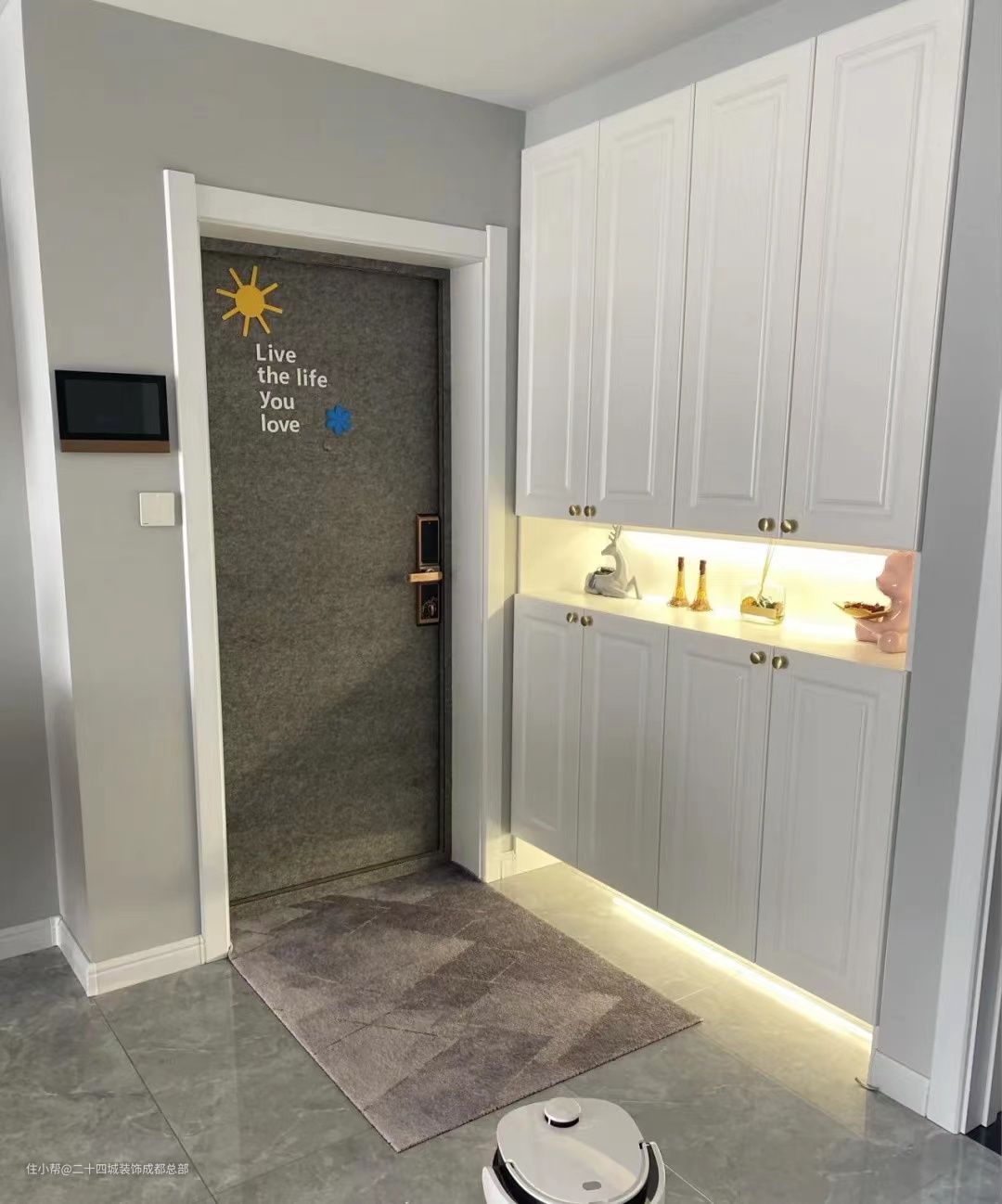 原户型自带的入户门比较丑,装修的时候加了个白色的实木门套,并且用自粘毛毡门贴进行了改造,现在好看了许多。