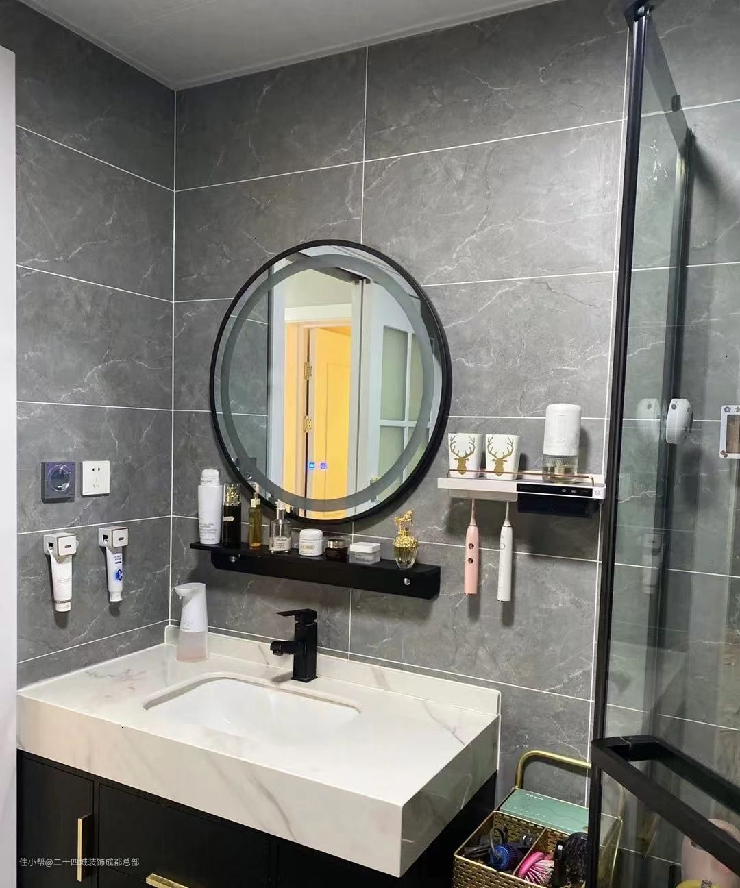 卫生间比较方正,不能做彻底的干湿分区,只是做了不同功能空间的划分。进门是一个洗手柜,台面做了台下盆的设计,更方便打理台面的水渍。柜体、镜子和置物架都是黑色的,整体形成经典的黑白配。