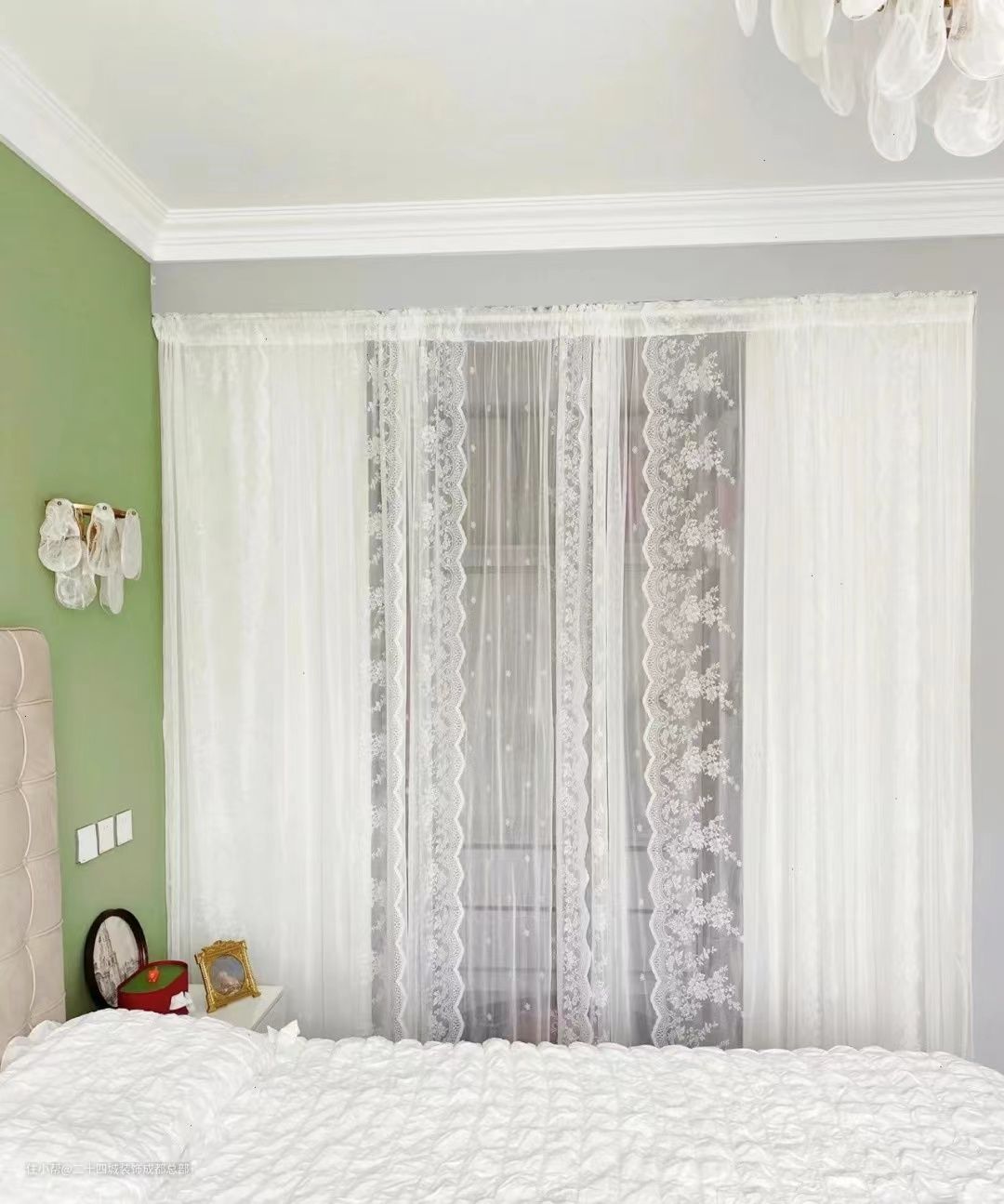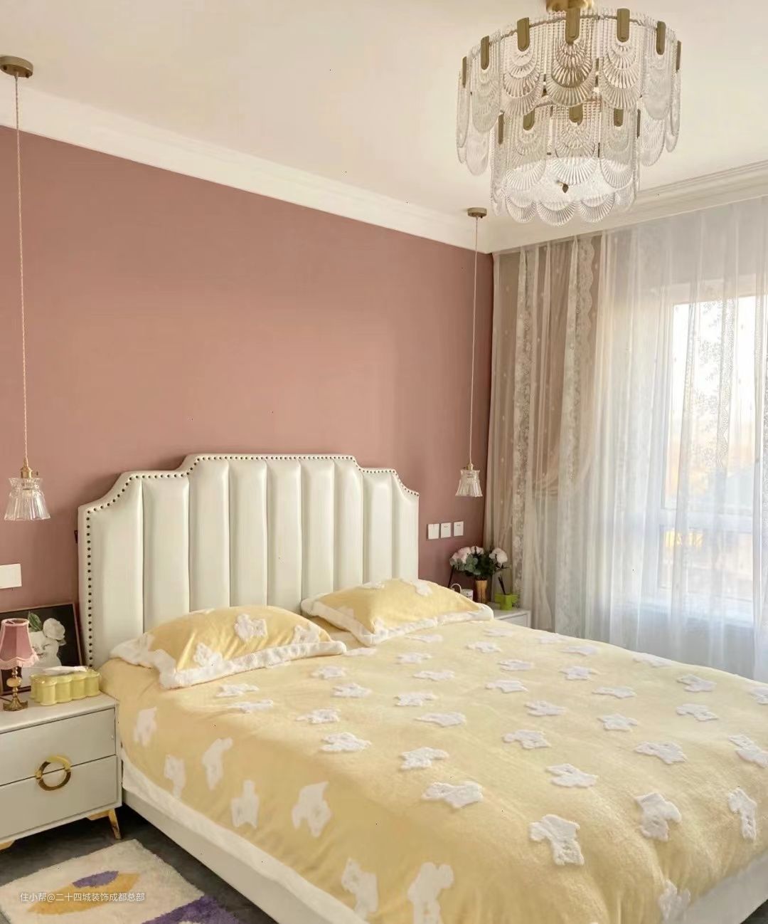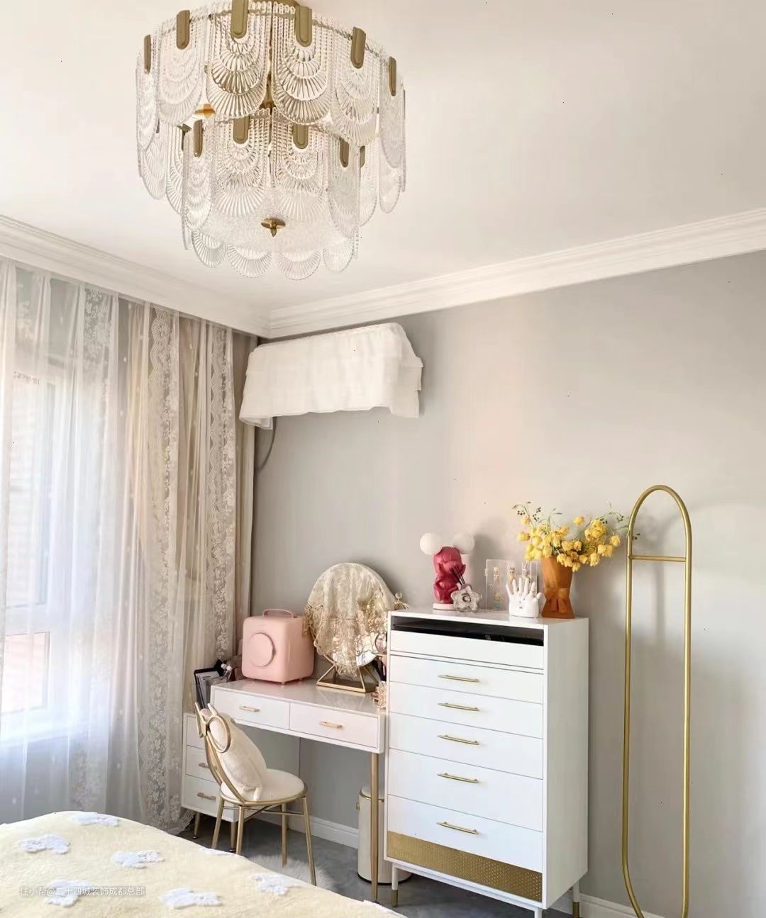 顶面正中间一盏大的金色水晶灯,搭配床头柜上两盏小的金色水晶吊灯,加上白色的窗纱,是个公主房,没错了。