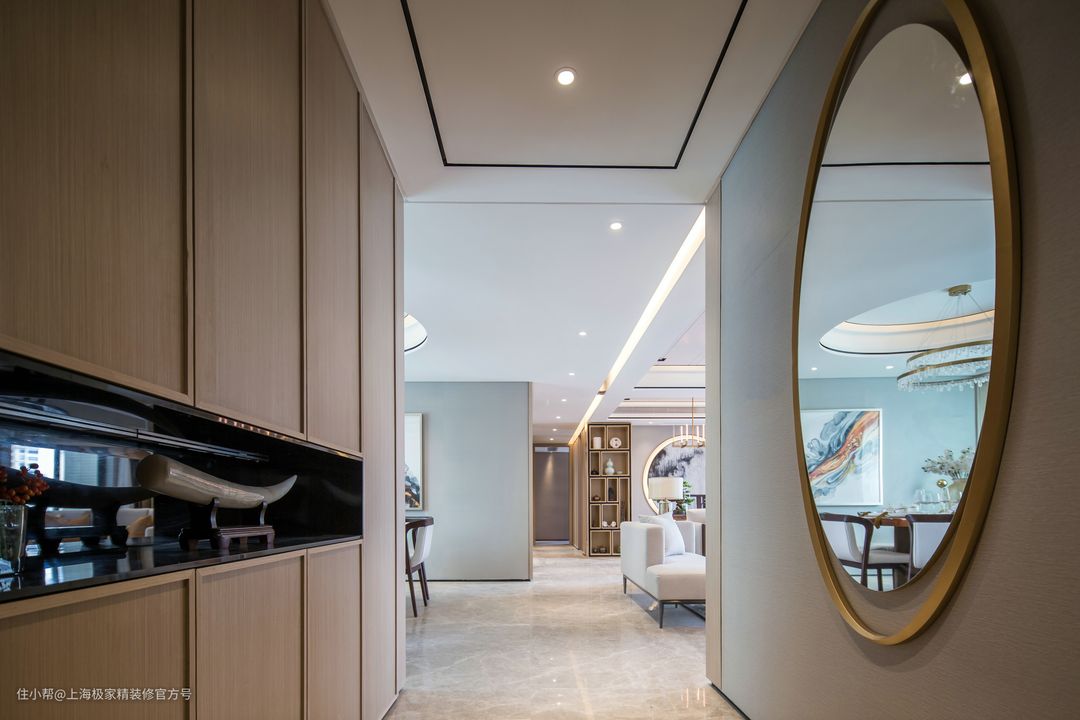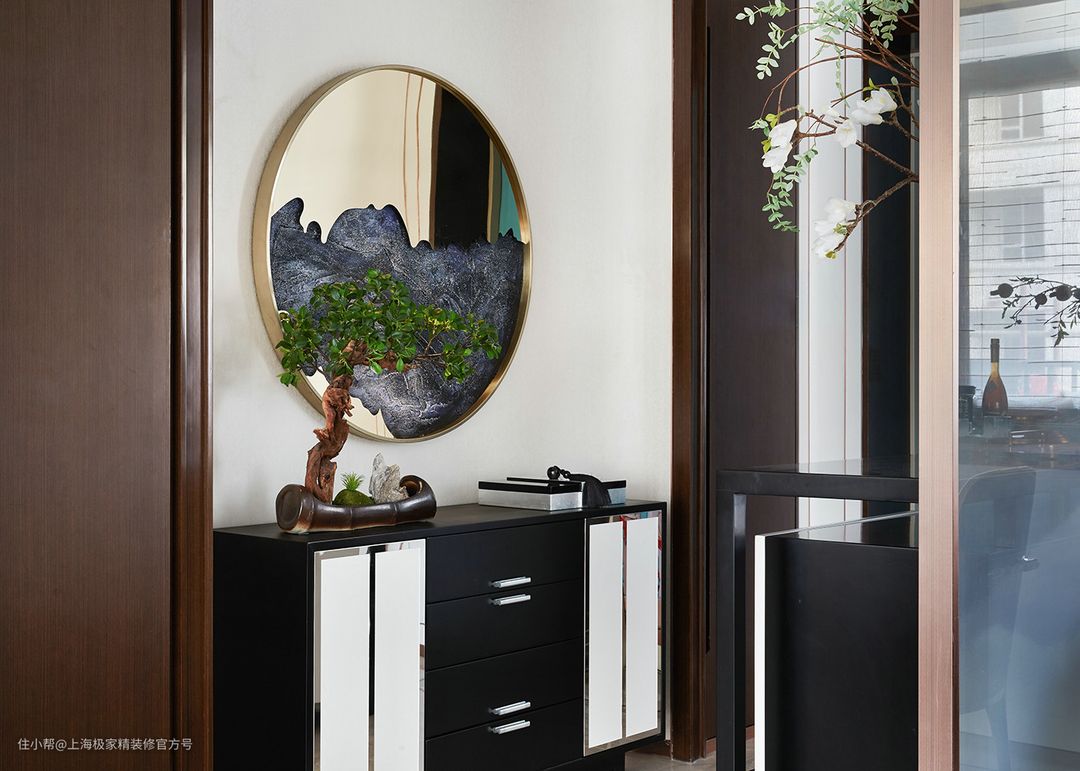 入户区需要做收纳设计,比如最日常使用的鞋子、服饰等物品以及达到装饰效果,多功能玄关定制柜,进出门方便很多。换鞋凳+挂衣区+穿衣镜入户区采用一通到顶,足够的储物空间,进出门收纳非常实用。镂空换鞋凳和挂衣区,看起来不算很特别,但是坐着换鞋,随手挂衣服,真的是舒服方便。