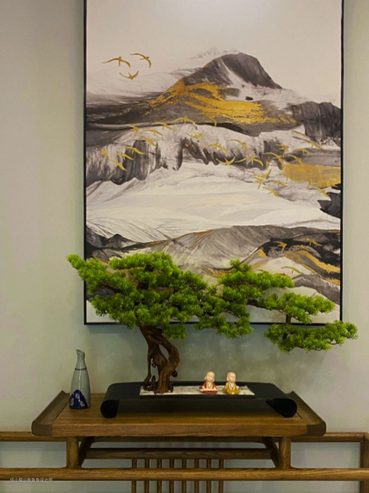 大家可以欣赏欣赏在新中式风住宅下,黄杨作为室内景观的效果是如何的~(样品展示,实际效果会更加自然、协调)