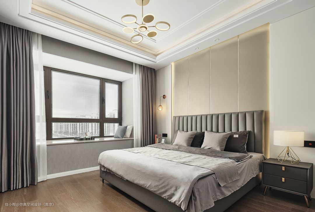 🌱在卧室的设计中,我们建议床具选择皮质,这样可以更好的与硬包的皮纹相搭配。同时皮质的床头靠背也会更美观,更舒适,也更符合轻奢的氛围。