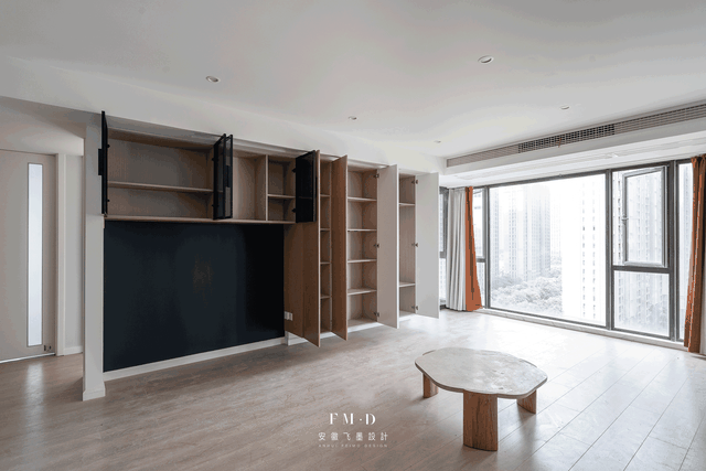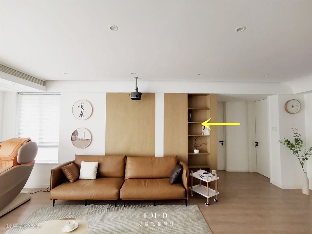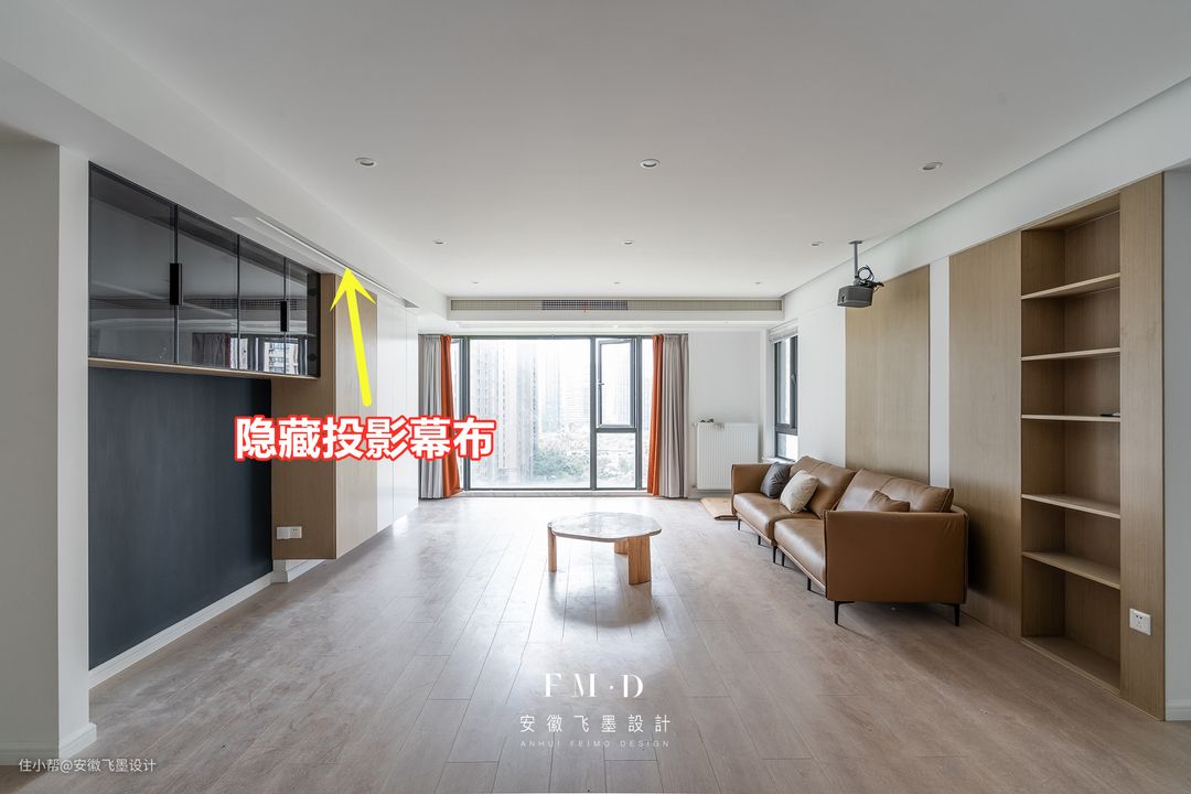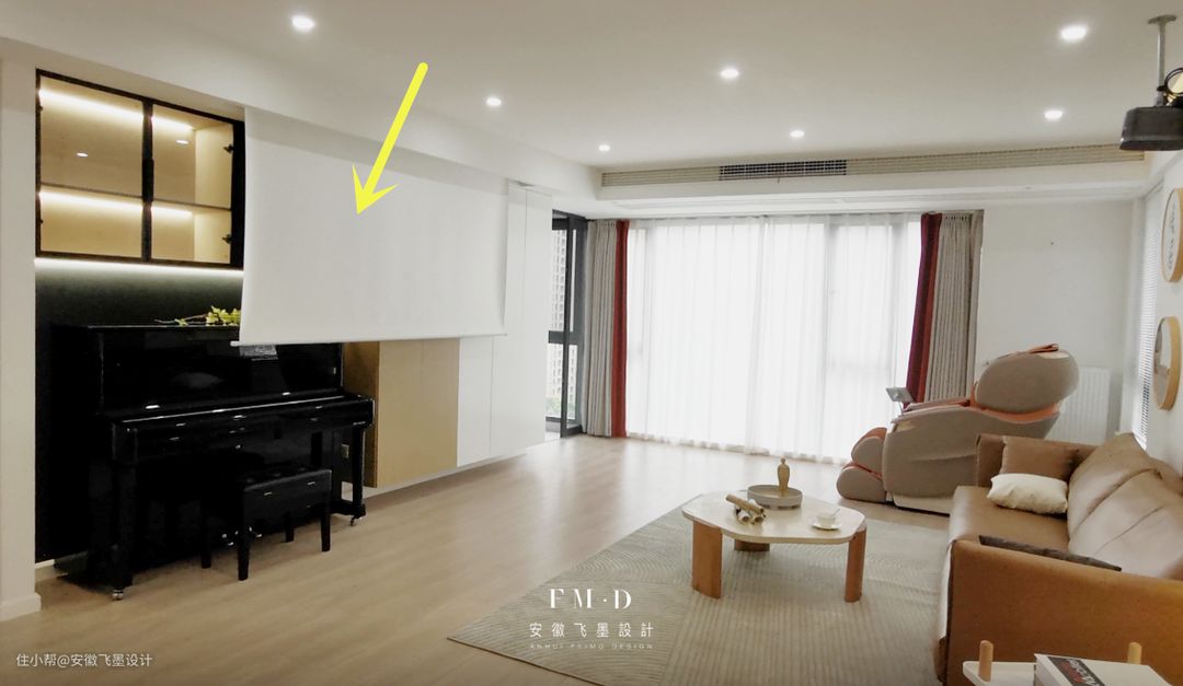 将原本3.8m长的电视墙分为2部分,那么电视该放哪儿呢?选择落地式电视容易落灰,因此干脆不要电视,选择投影幕布,让大横厅随时都能开启家庭影院模式。