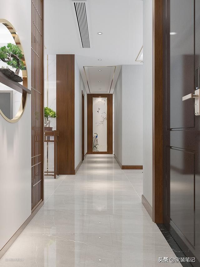 通过艺术隔断,形成了一个玄关区域,同时艺术隔断也成了打开房门很好的一个端景,一个极具中式特色的风景。从玄关可以看到过道的尽头,一幅艺术画悬挂在墙面,也是玄关望过道很好的端景。鞋柜底下做了两层留空的处理,放一些常穿的鞋子,两层的摆放,看上去更加整洁一些。