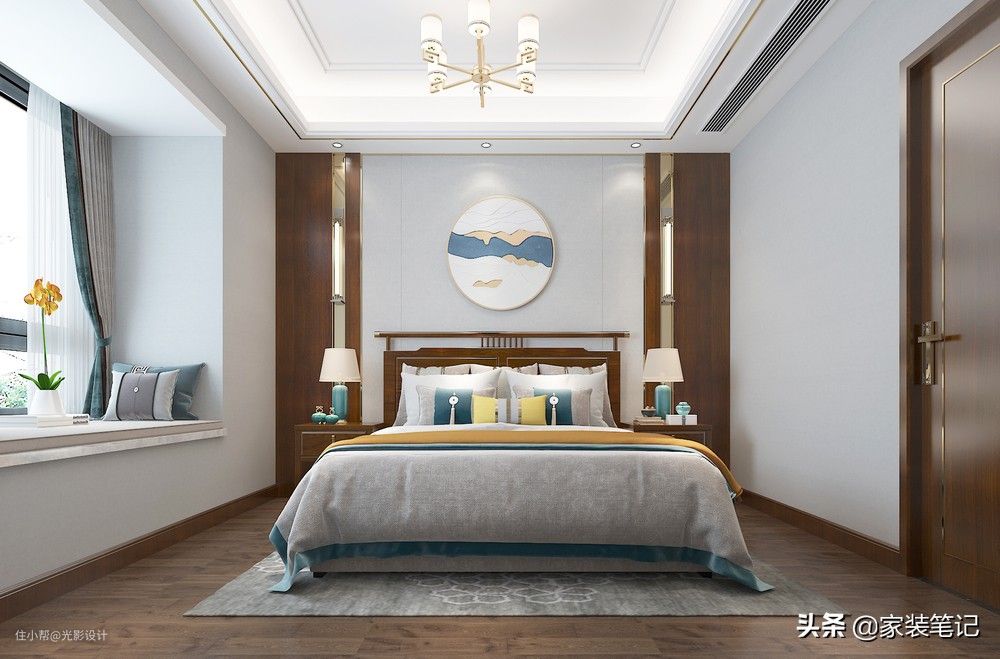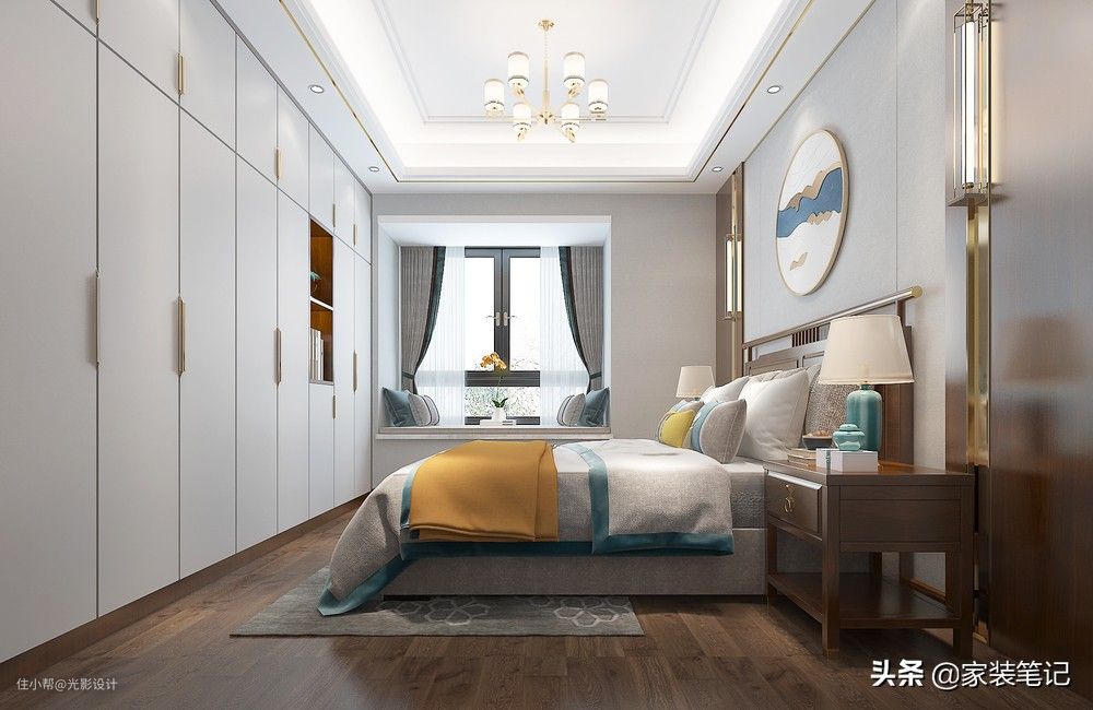 主卧室的主要硬装特色亮点就在于床头,这也是卧室里面的视觉焦点,中间一幅圆形的画,来展现出中式的传统艺术特色,两边对称式的护墙板造型,还有壁灯对称,中式味十足。另外床尾还有一整面墙的衣柜,储物收纳是真的强大,整个卧室非常赞。