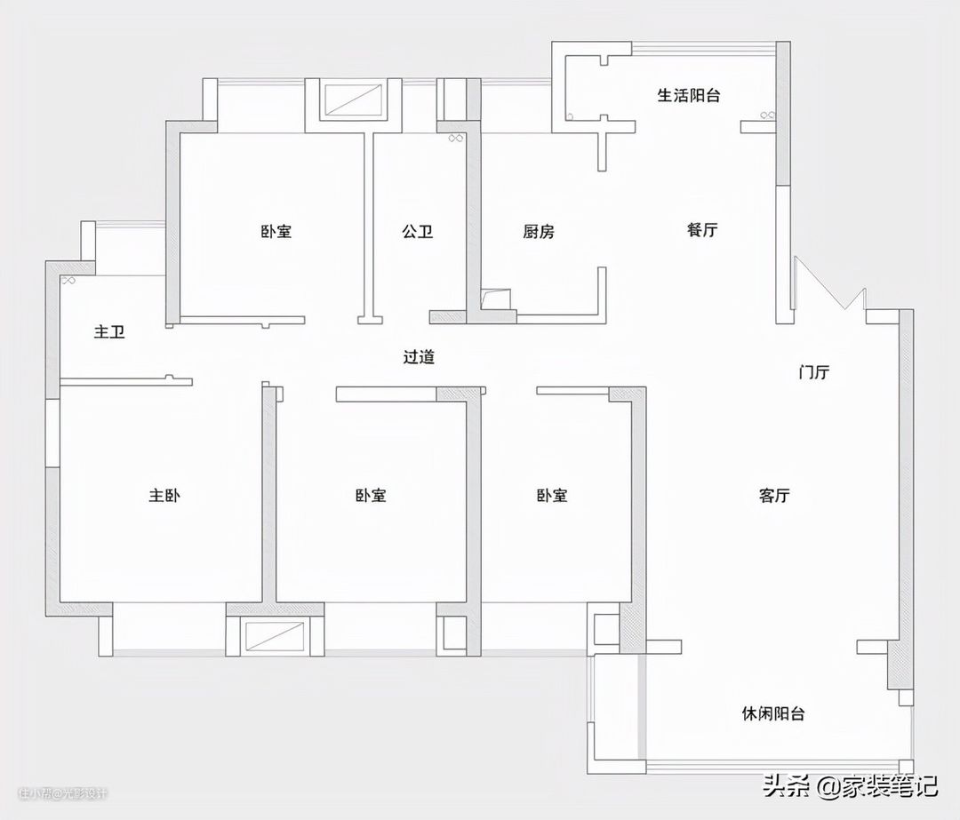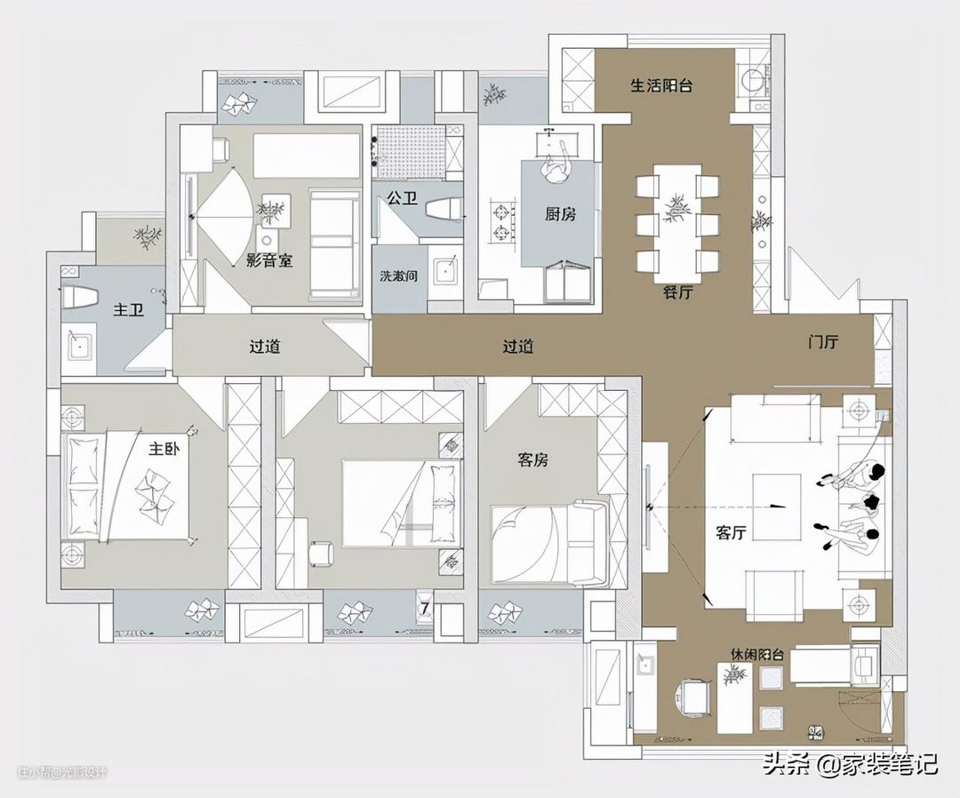 通过平面布置改造之后,入户门和客厅之间做了一个隔断,简单地规划了一个门厅(玄关)区域出来,增加了客厅的私密性,进屋不至于一览无遗。客厅旁边做休闲阳台,餐厅旁边做生活阳台。四间卧室,利用一间卧室做了影音室,纳入到主卧室里面,主卧室做了一个大的套房。公卫也做了很好的干湿分离的设计布局,里面上洗手间,外面洗漱都互不干扰。