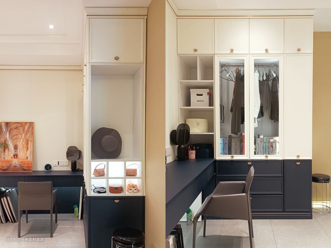 图1左,进门衣柜侧面设计,开架随手放小物件、装饰品、包包钥匙等,地柜可储鞋,吊柜丰富收纳;图1右,整体经典蓝白配色中运用开架与玻璃柜设计在法式典雅中增添精致与通透,玻璃柜挂衣区+抽屉叠放,开架延伸书桌,空间更富功能张力。