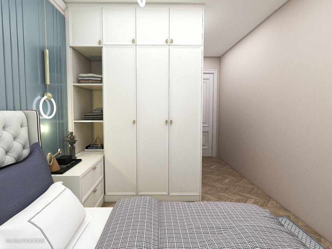 图4-6,衣柜Z字型延伸床头柜与进门过道柜,过道地柜置物台+隔板装饰,转角衣柜纯白一体色,通过开架延伸床头柜兼做梳妆台,设计感十足,实用美观。