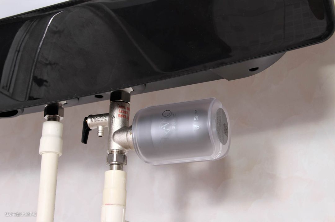 1.前置阻垢器,外观和前置过滤器很像。只不过这东西是安装在热水器的冷水管上的,安装后是这个样子▼