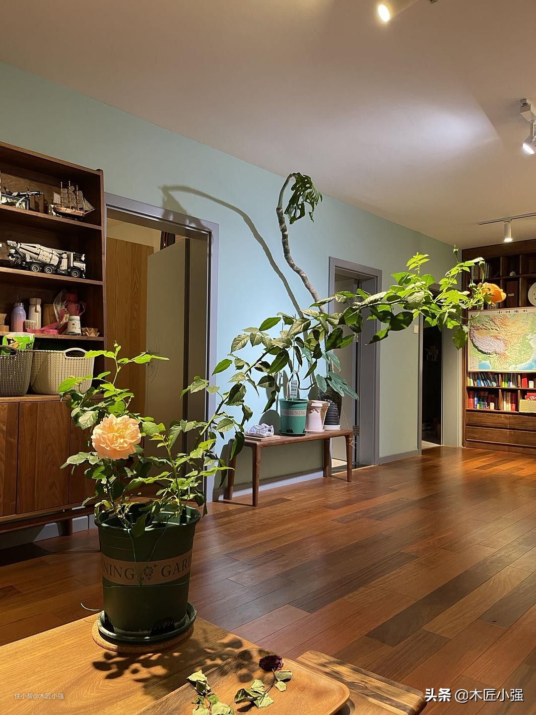 尤其原木地板与原木家具的温暖质感,搭配大叶绿植,更是好看。