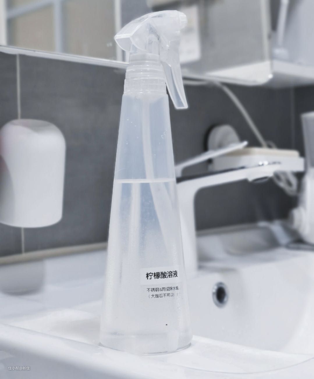 这里可以用柠檬酸溶液装在喷壶里, 喷在物品上进行清洁更方便,如果有水垢重的情况下,也可以用保鲜膜敷上,加速反应。