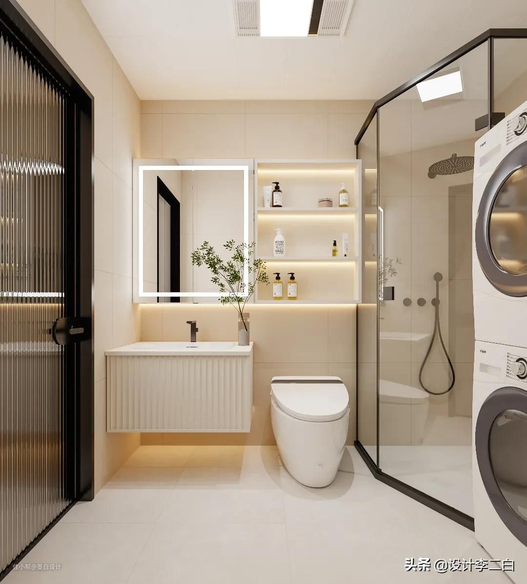 洗手间采用干湿分离的设计,多处收纳空间充分满足了家庭的使用需求。色彩与灯光看起来温暖而洁净,在光影的映照中显得更加高级,空间中更多的是生活的质感与气息。